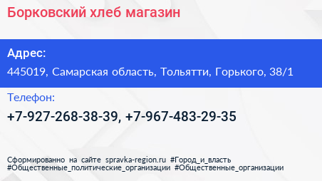 Борковский хлеб, магазин по адресу 445019, Самарская область, Тольятти, Горького, 38/1 в дальнейшем Организация, размещена в следующих категориях: