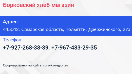 Борковский хлеб, магазин по адресу 445042, Самарская область, Тольятти, Дзержинского, 27а в дальнейшем Организация, размещена в следующих категориях: