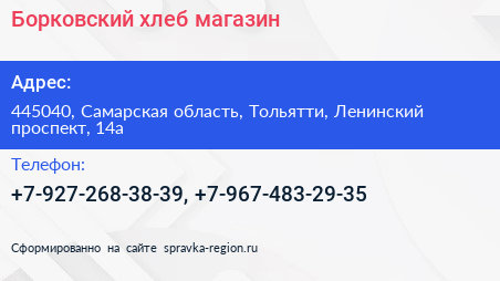 Борковский хлеб, магазин по адресу 445040, Самарская область, Тольятти, Ленинский проспект, 14а в дальнейшем Организация, размещена в следующих категориях: