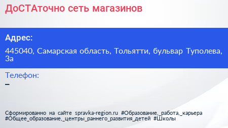 ДоСТАточно, сеть магазинов по адресу 445040, Самарская область, Тольятти, бульвар Туполева, 3а в дальнейшем Организация, размещена в следующих категориях: