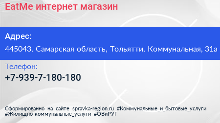 EatMe!, интернет-магазин по адресу 445043, Самарская область, Тольятти, Коммунальная, 31а в дальнейшем Организация, размещена в следующих категориях: