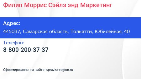 Филип Моррис Сэйлз энд Маркетинг по адресу 445037, Самарская область, Тольятти, Юбилейная, 40 в дальнейшем Организация, размещена в следующих категориях: