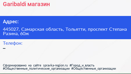 Garibaldi, магазин по адресу 445027, Самарская область, Тольятти, проспект Степана Разина, 60ж в дальнейшем Организация, размещена в следующих категориях: