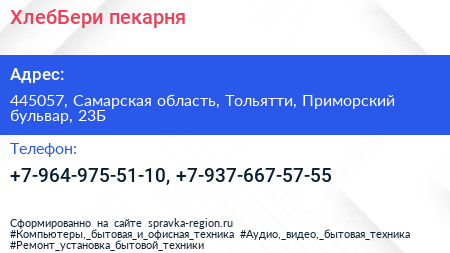 ХлебБери, пекарня по адресу 445057, Самарская область, Тольятти, Приморский бульвар, 23Б в дальнейшем Организация, размещена в следующих категориях: