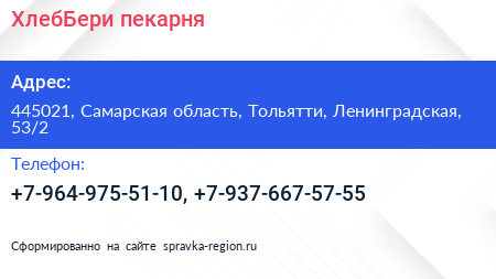 ХлебБери, пекарня по адресу 445021, Самарская область, Тольятти, Ленинградская, 53/2 в дальнейшем Организация, размещена в следующих категориях: