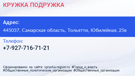 КРУЖКА ПОДРУЖКА по адресу 445037, Самарская область, Тольятти, Юбилейная, 25в в дальнейшем Организация, размещена в следующих категориях: