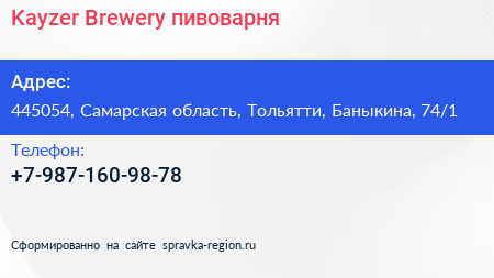 Kayzer Brewery, пивоварня по адресу 445054, Самарская область, Тольятти, Баныкина, 74/1 в дальнейшем Организация, размещена в следующих категориях: