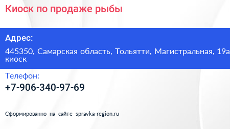 Киоск по продаже рыбы по адресу 445350, Самарская область, Тольятти, Магистральная, 19а киоск в дальнейшем Организация, размещена в следующих категориях: