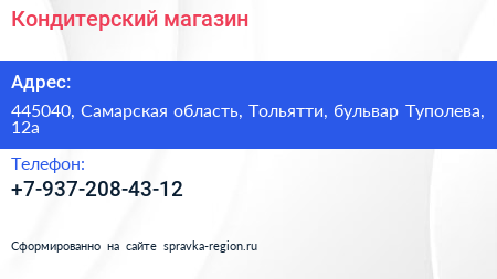 Кондитерский магазин по адресу 445040, Самарская область, Тольятти, бульвар Туполева, 12а в дальнейшем Организация, размещена в следующих категориях:
