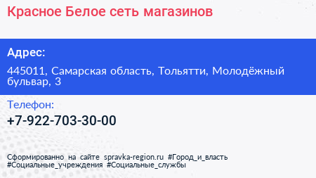 Красное & Белое, сеть магазинов по адресу 445011, Самарская область, Тольятти, Молодёжный бульвар, 3 в дальнейшем Организация, размещена в следующих категориях: