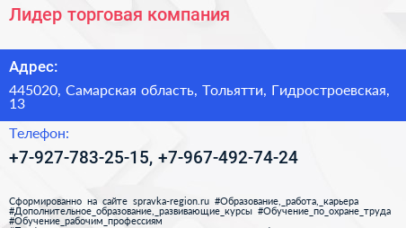 Лидер, торговая компания по адресу 445020, Самарская область, Тольятти, Гидростроевская, 13 в дальнейшем Организация, размещена в следующих категориях: