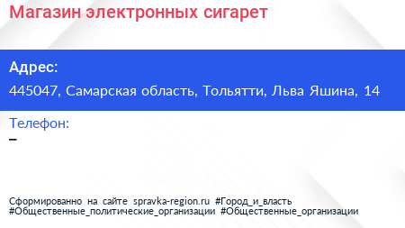 Магазин электронных сигарет по адресу 445047, Самарская область, Тольятти, Льва Яшина, 14 в дальнейшем Организация, размещена в следующих категориях: