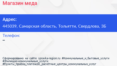 Магазин меда по адресу 445039, Самарская область, Тольятти, Свердлова, 3Б в дальнейшем Организация, размещена в следующих категориях: