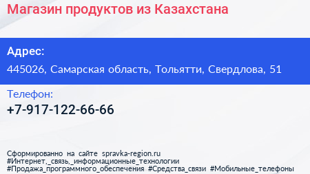 Магазин продуктов из Казахстана по адресу 445026, Самарская область, Тольятти, Свердлова, 51 в дальнейшем Организация, размещена в следующих категориях: