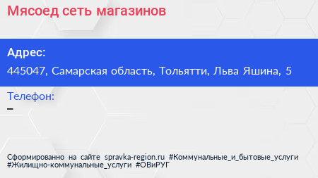 Мясоед, сеть магазинов по адресу 445047, Самарская область, Тольятти, Льва Яшина, 5 в дальнейшем Организация, размещена в следующих категориях: