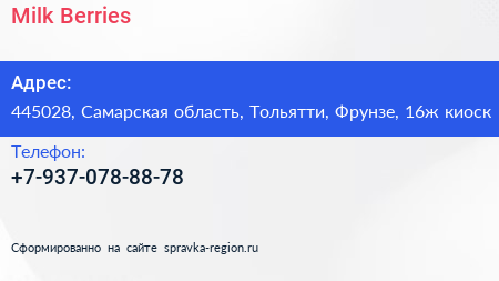 Milk & Berries по адресу 445028, Самарская область, Тольятти, Фрунзе, 16ж киоск в дальнейшем Организация, размещена в следующих категориях: