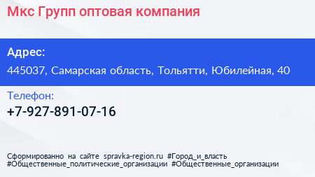 Мкс Групп, оптовая компания по адресу 445037, Самарская область, Тольятти, Юбилейная, 40 в дальнейшем Организация, размещена в следующих категориях: