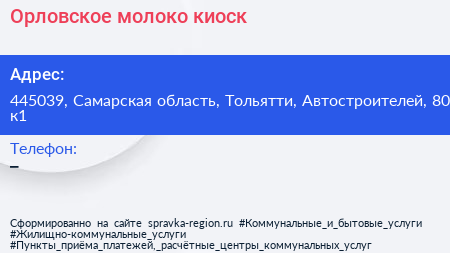 Орловское молоко, киоск по адресу 445039, Самарская область, Тольятти, Автостроителей, 80 к1 в дальнейшем Организация, размещена в следующих категориях: