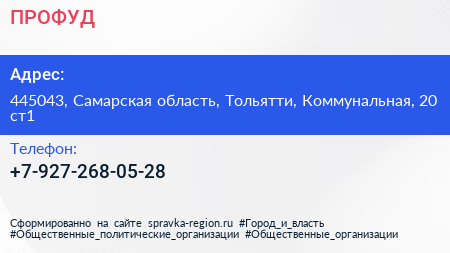 ПРОФУД по адресу 445043, Самарская область, Тольятти, Коммунальная, 20 ст1 в дальнейшем Организация, размещена в следующих категориях: