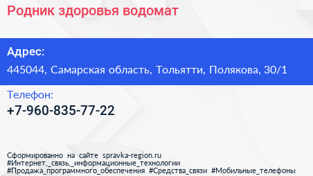 Родник здоровья, водомат по адресу 445044, Самарская область, Тольятти, Полякова, 30/1 в дальнейшем Организация, размещена в следующих категориях: