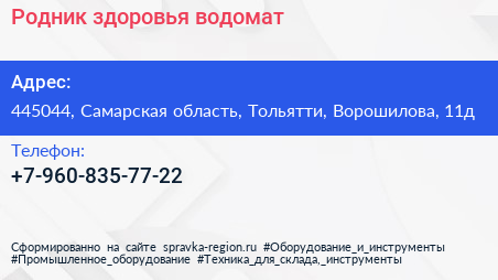 Родник здоровья, водомат по адресу 445044, Самарская область, Тольятти, Ворошилова, 11д в дальнейшем Организация, размещена в следующих категориях: