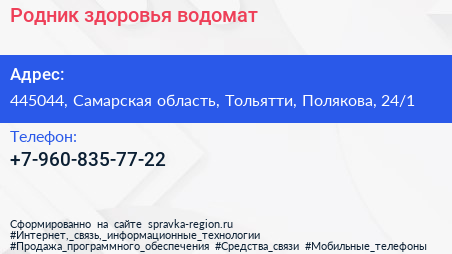 Родник здоровья, водомат по адресу 445044, Самарская область, Тольятти, Полякова, 24/1 в дальнейшем Организация, размещена в следующих категориях: