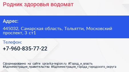 Родник здоровья, водомат по адресу 445032, Самарская область, Тольятти, Московский проспект, 3 ст1 в дальнейшем Организация, размещена в следующих категориях: