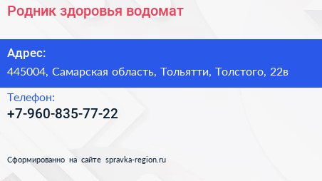 Родник здоровья, водомат по адресу 445004, Самарская область, Тольятти, Толстого, 22в в дальнейшем Организация, размещена в следующих категориях:
