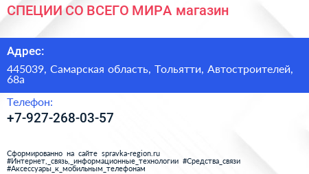 СПЕЦИИ СО ВСЕГО МИРА, магазин по адресу 445039, Самарская область, Тольятти, Автостроителей, 68а в дальнейшем Организация, размещена в следующих категориях: