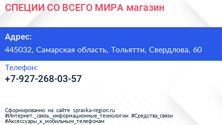 СПЕЦИИ СО ВСЕГО МИРА, магазин по адресу 445032, Самарская область, Тольятти, Свердлова, 60 в дальнейшем Организация, размещена в следующих категориях: