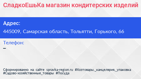 СладкоЕшьКа, магазин кондитерских изделий по адресу 445009, Самарская область, Тольятти, Горького, 66 в дальнейшем Организация, размещена в следующих категориях: