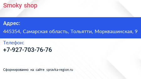 Smoky shop по адресу 445354, Самарская область, Тольятти, Морквашинская, 9 в дальнейшем Организация, размещена в следующих категориях: