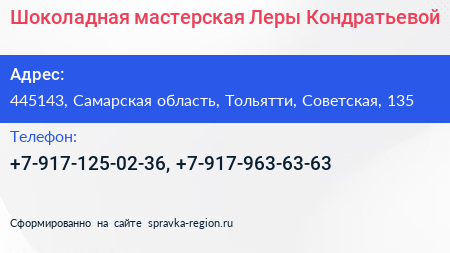Шоколадная мастерская Леры Кондратьевой по адресу 445143, Самарская область, Тольятти, Советская, 135 в дальнейшем Организация, размещена в следующих категориях: