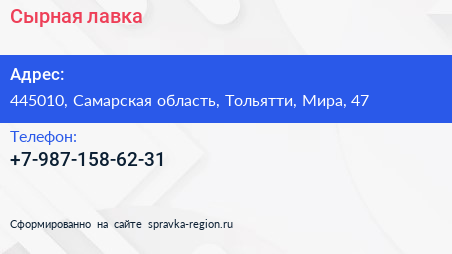Сырная лавка по адресу 445010, Самарская область, Тольятти, Мира, 47 в дальнейшем Организация, размещена в следующих категориях:
