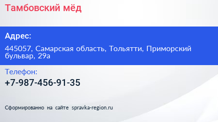 Тамбовский мёд по адресу 445057, Самарская область, Тольятти, Приморский бульвар, 29а в дальнейшем Организация, размещена в следующих категориях: