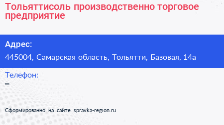 Тольяттисоль, производственно-торговое предприятие по адресу 445004, Самарская область, Тольятти, Базовая, 14а в дальнейшем Организация, размещена в следующих категориях: