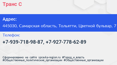 Транс-С по адресу 445030, Самарская область, Тольятти, Цветной бульвар, 7 в дальнейшем Организация, размещена в следующих категориях: