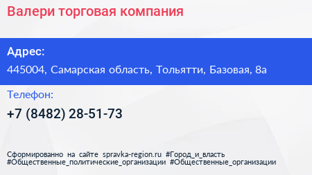 Валери, торговая компания по адресу 445004, Самарская область, Тольятти, Базовая, 8а в дальнейшем Организация, размещена в следующих категориях: