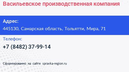 Васильевское, производственная компания по адресу 445130, Самарская область, Тольятти, Мира, 71 в дальнейшем Организация, размещена в следующих категориях: