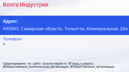 Волга Индустрия по адресу 445043, Самарская область, Тольятти, Коммунальная, 26а в дальнейшем Организация, размещена в следующих категориях: