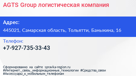 AGTS Group, логистическая компания по адресу 445021, Самарская область, Тольятти, Баныкина, 16 в дальнейшем Организация, размещена в следующих категориях: