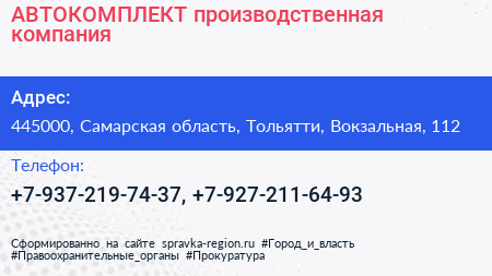 АВТОКОМПЛЕКТ, производственная компания по адресу 445000, Самарская область, Тольятти, Вокзальная, 112 в дальнейшем Организация, размещена в следующих категориях: