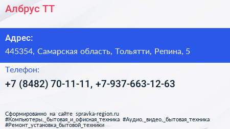 Албрус ТТ по адресу 445354, Самарская область, Тольятти, Репина, 5 в дальнейшем Организация, размещена в следующих категориях:
