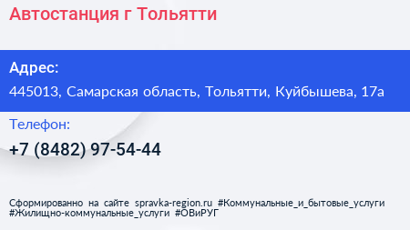 Автостанция, г. Тольятти по адресу 445013, Самарская область, Тольятти, Куйбышева, 17а в дальнейшем Организация, размещена в следующих категориях: