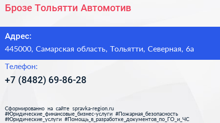 Брозе Тольятти Автомотив по адресу 445000, Самарская область, Тольятти, Северная, 6а в дальнейшем Организация, размещена в следующих категориях: