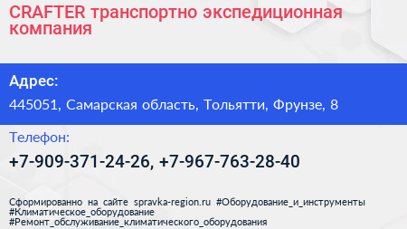 CRAFTER, транспортно-экспедиционная компания по адресу 445051, Самарская область, Тольятти, Фрунзе, 8 в дальнейшем Организация, размещена в следующих категориях: