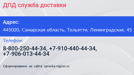 ДПД, служба доставки по адресу 445020, Самарская область, Тольятти, Ленинградская, 45 в дальнейшем Организация, размещена в следующих категориях: