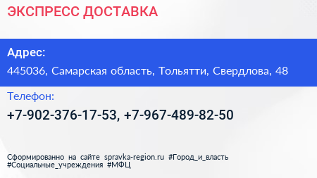 ЭКСПРЕСС ДОСТАВКА по адресу 445036, Самарская область, Тольятти, Свердлова, 48 в дальнейшем Организация, размещена в следующих категориях: