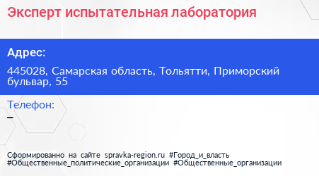 Эксперт, испытательная лаборатория по адресу 445028, Самарская область, Тольятти, Приморский бульвар, 55 в дальнейшем Организация, размещена в следующих категориях:
