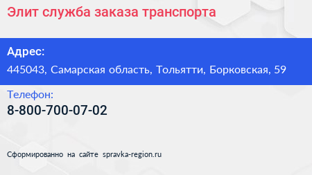 Элит, служба заказа транспорта по адресу 445043, Самарская область, Тольятти, Борковская, 59 в дальнейшем Организация, размещена в следующих категориях: